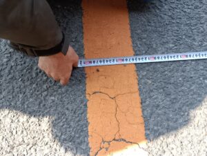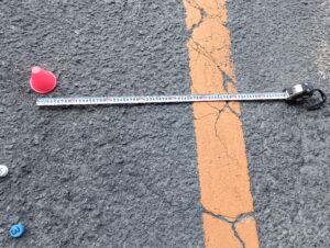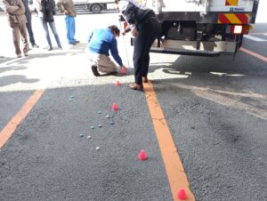 車両の角に指示棒を取り付け、右左折をした際にどの辺りを通過するかをドライバーさん全員にペットボトルのキャップを置いてもらい予測しました。