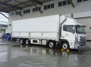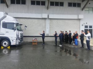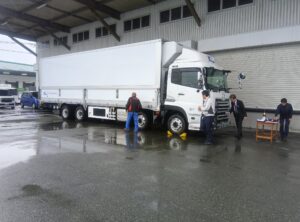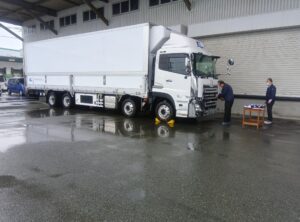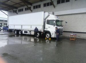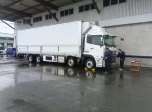 本日はあいにくの雨模様ですが、本社で大型冷凍ウィング新車の納車がありました。